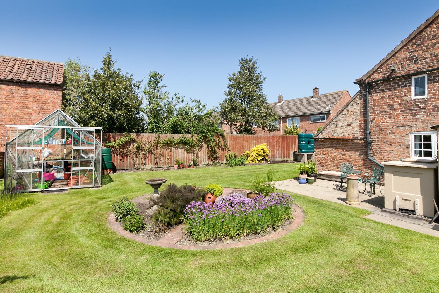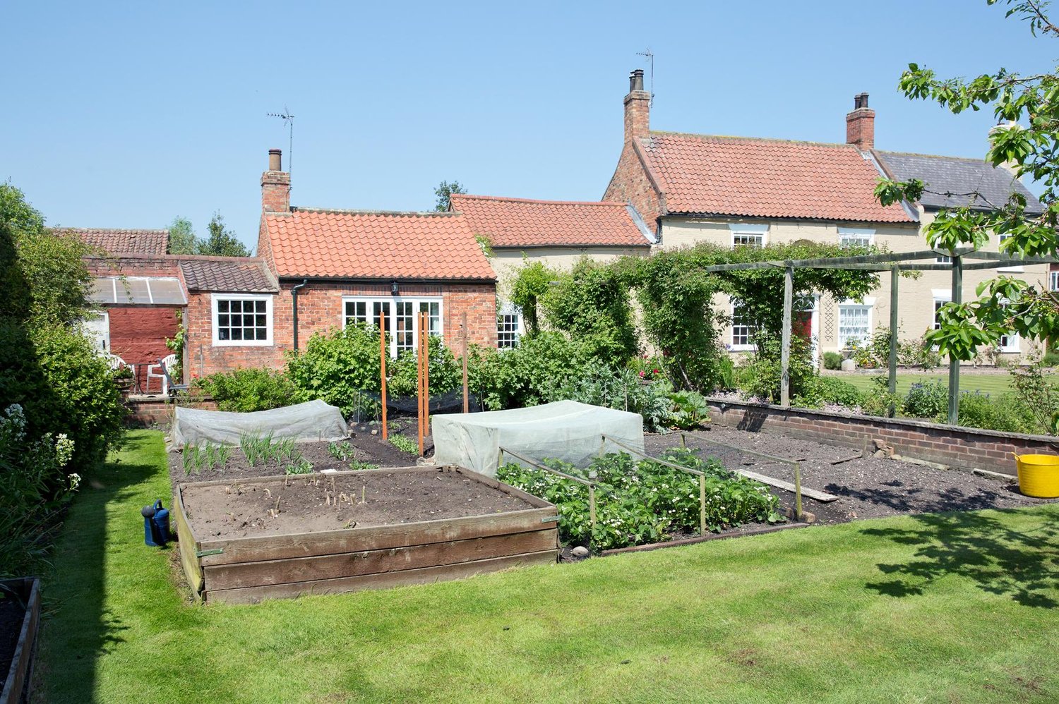 A substantial garden with a patio and vegetable plot